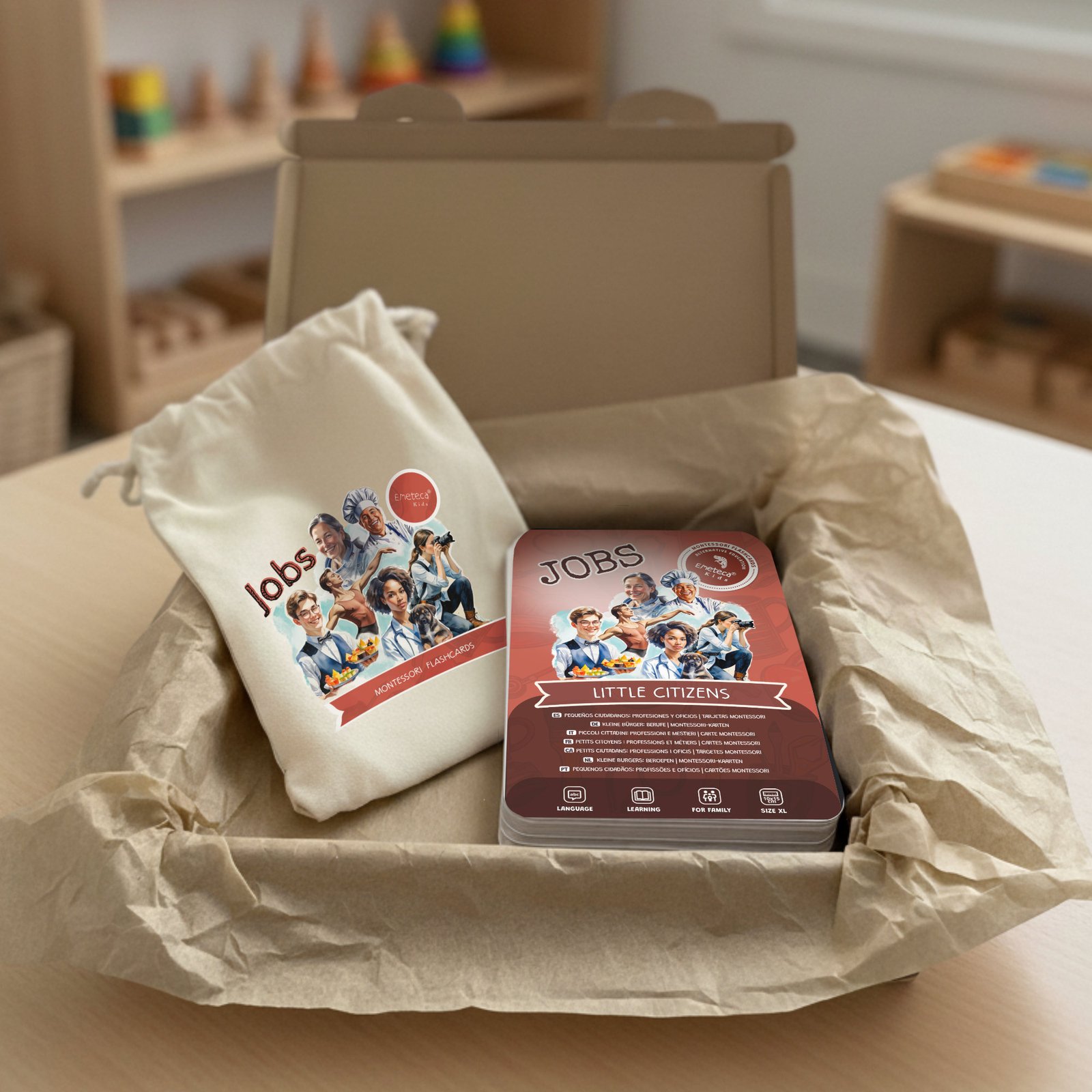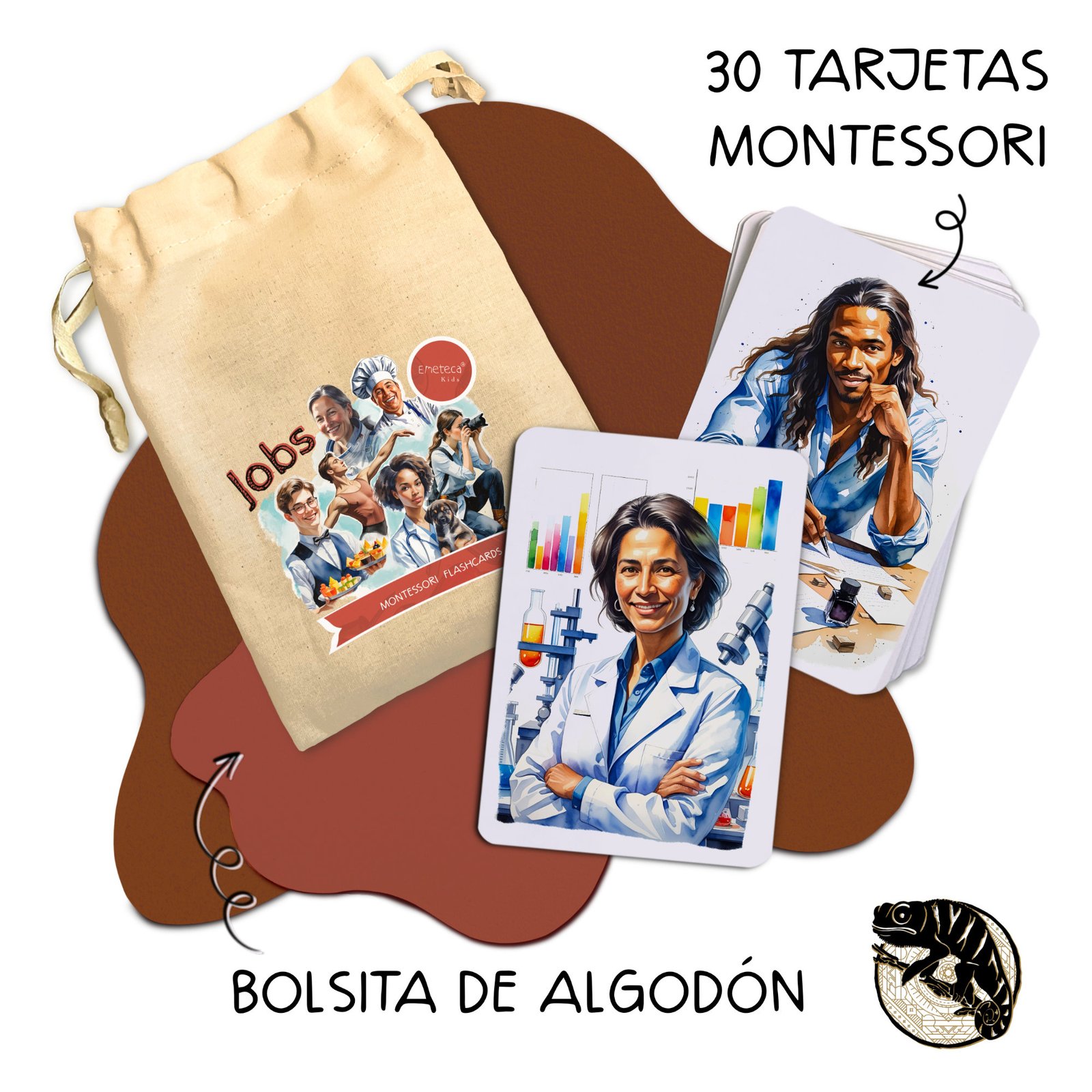 Este set de 30 tarjetas didácticas Montessori ayuda a los niños a reconocer diferentes profesiones y oficios, invitándolos a conversar sobre cómo cada uno contribuye a la comunidad y al bienestar colectivo.