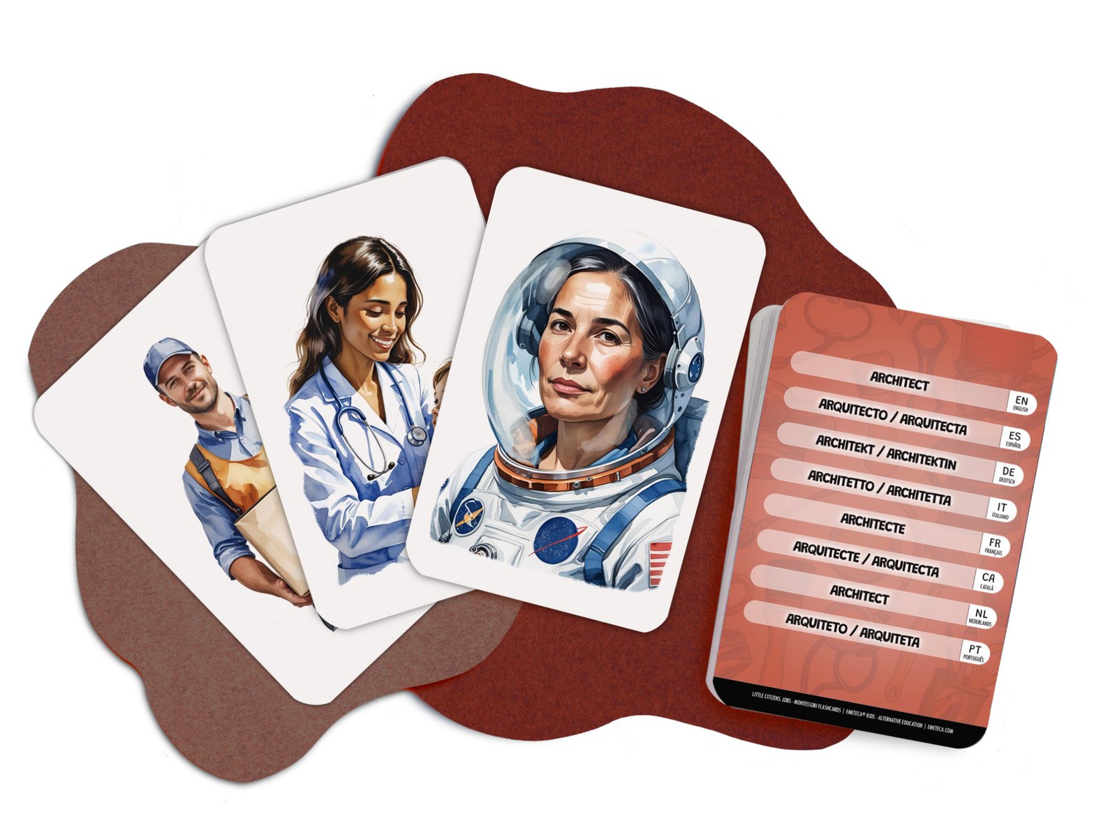 Incluyen el nombre de cada profesión en castellano, inglés, francés, alemán, italiano, catalán, portugués y neerlandés, para una primera aproximación al aprendizaje plurilingüe.