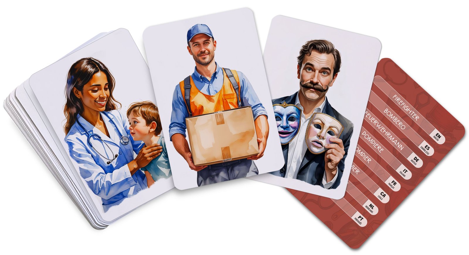 - 30 tarjetas a doble cara con ilustraciones realistas de profesiones y oficios.