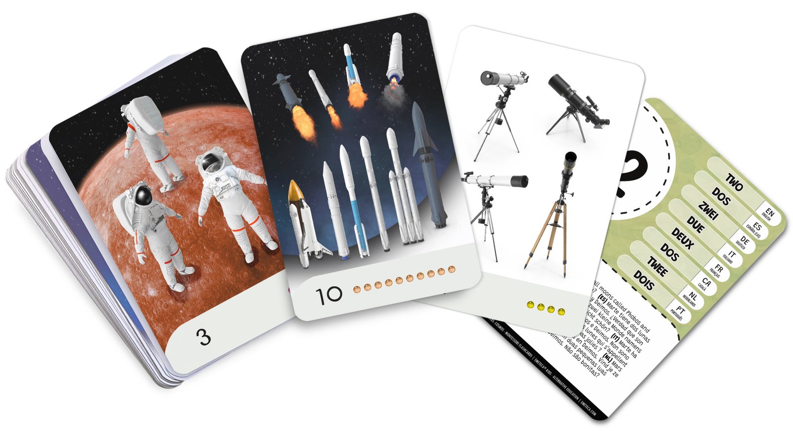 Este set de 30 tarjetas didácticas Montessori invita a los niños a descubrir los números a través de ilustraciones realistas del Cosmos.
